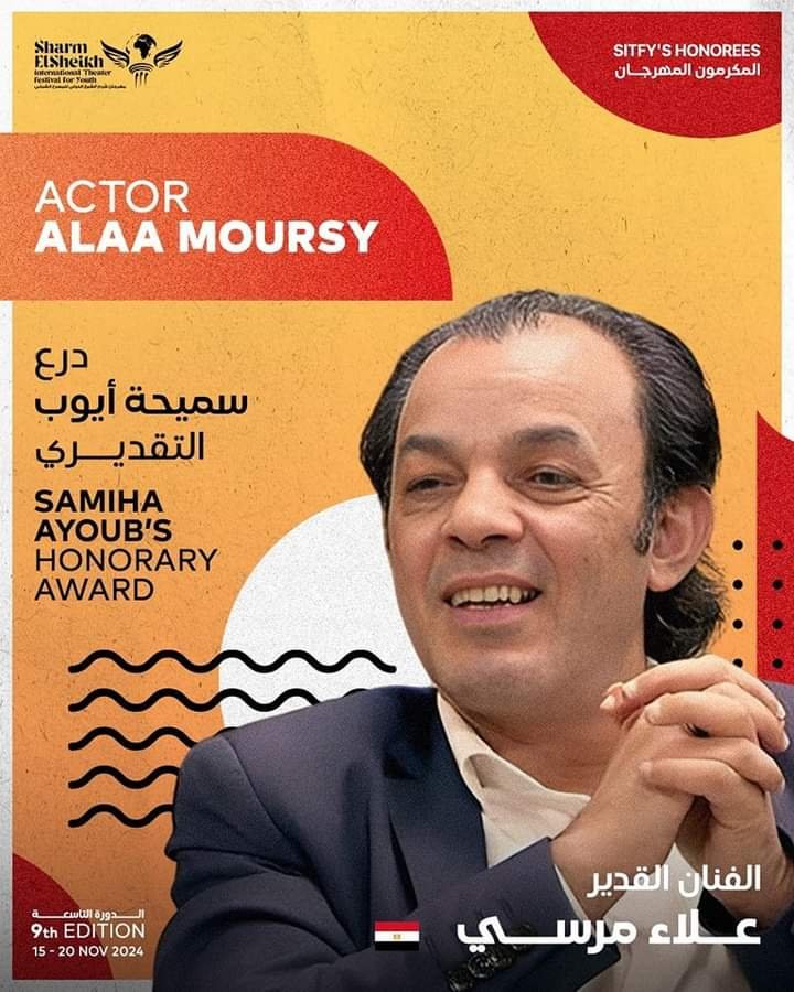 يكرم مهرجان شرم الشيخ الدولي للمسرح الشبابي برئاسة الفنان والمخرج مازن الغرباوي خلال دورته التاسعة ، الفنان القدير علاء مرسي ويمنحه درع الفنانة سميحة ايوب التقديري خلال الدورة الجديدة، والتي مقررا إقامتها في الفترة من 15 وحتي 20 نوفمبر 2024 بمدينة شرم الشيخ بمحافظة جنوب سيناء .
