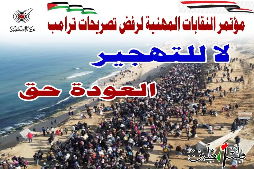 وأكدت النقابات المشاركة أن مثل هذه التصريحات تعد انتهاكًا واضحًا لحقوق الشعب الفلسطيني المشروعة، وتجاوزًا للقرارات الدولية، التي تؤكد حقه في إقامة دولته المستقلة على أرضه، معلنة دعمها ومساندتها للموقف الرسمي المصري الثابت الرافض للتهجير .