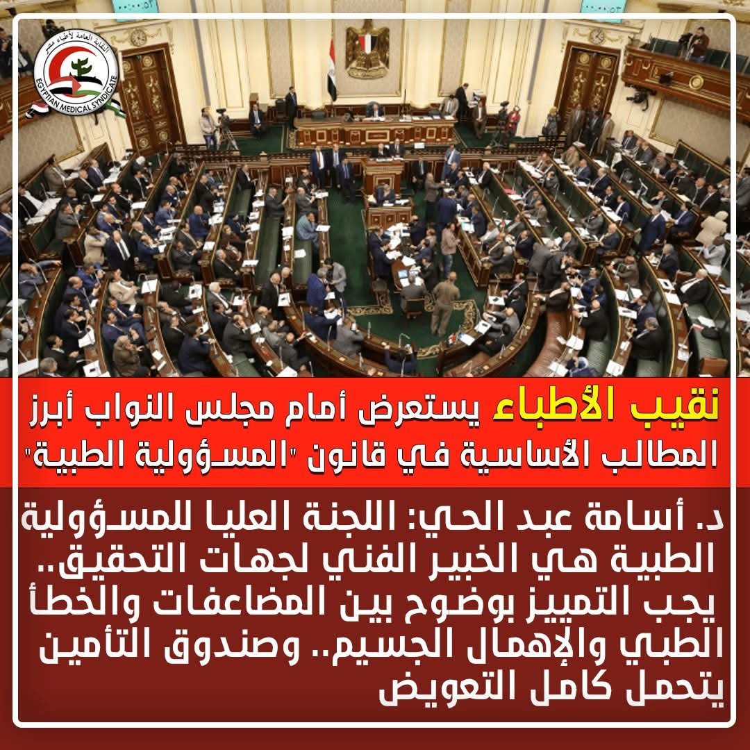 أكد نقيب الأطباء د. أسامة عبد الحي، خلال كلمته أمام الجلسة العامة لمجلس النواب لمناقشة مشروع قانون المسؤولية الطبية وسلامة المريض، أن هناك 4 محاور أساسية وضرورية يجب تضمينها في مشروع القانون.