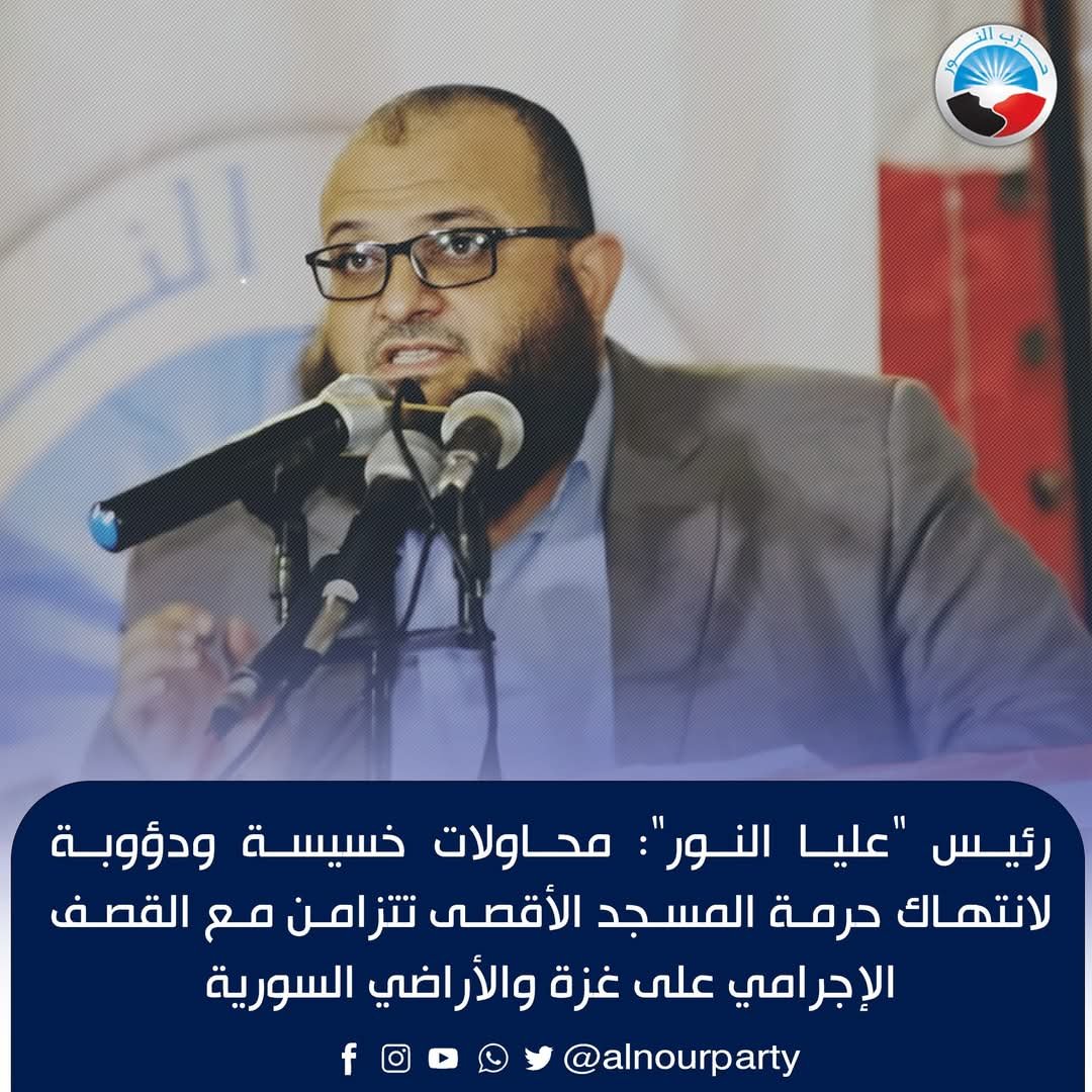 صرح المهندس سامح بسيوني رئيس الهيئة العليا لحزب النور أن ما يحدث من محاولات خسيسة ودؤوبة لانتهاك حرمة المسجد الأقصى واقتحام ساحاته من قبل المسئولين والمتطرفين الإسرائيلين بمعاونة قوات الاحتلال الصهيوني والاعتداء المستمر على حق المسلمين في ممارسة شعائرهم بحرية مطلقة داخل مقدساتهم، لهو انتهاك واضح لمقدسات المسلمين، وبيان واضح أن الصراع مع اليهود صراع عقدي ديني في المقام الأول.