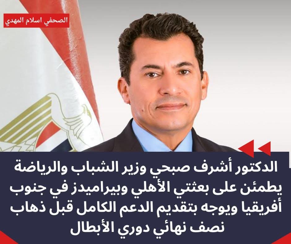 وأكد وزير الشباب والرياضة حرصه الكامل على متابعة أوضاع الفرق المصرية المشاركة في المنافسات القارية، مشدداً على ضرورة تهيئة كافة الظروف المناسبة أمام الأندية لتحقيق أفضل النتائج وتمثيل الكرة المصرية بالشكل الذي يليق بها.