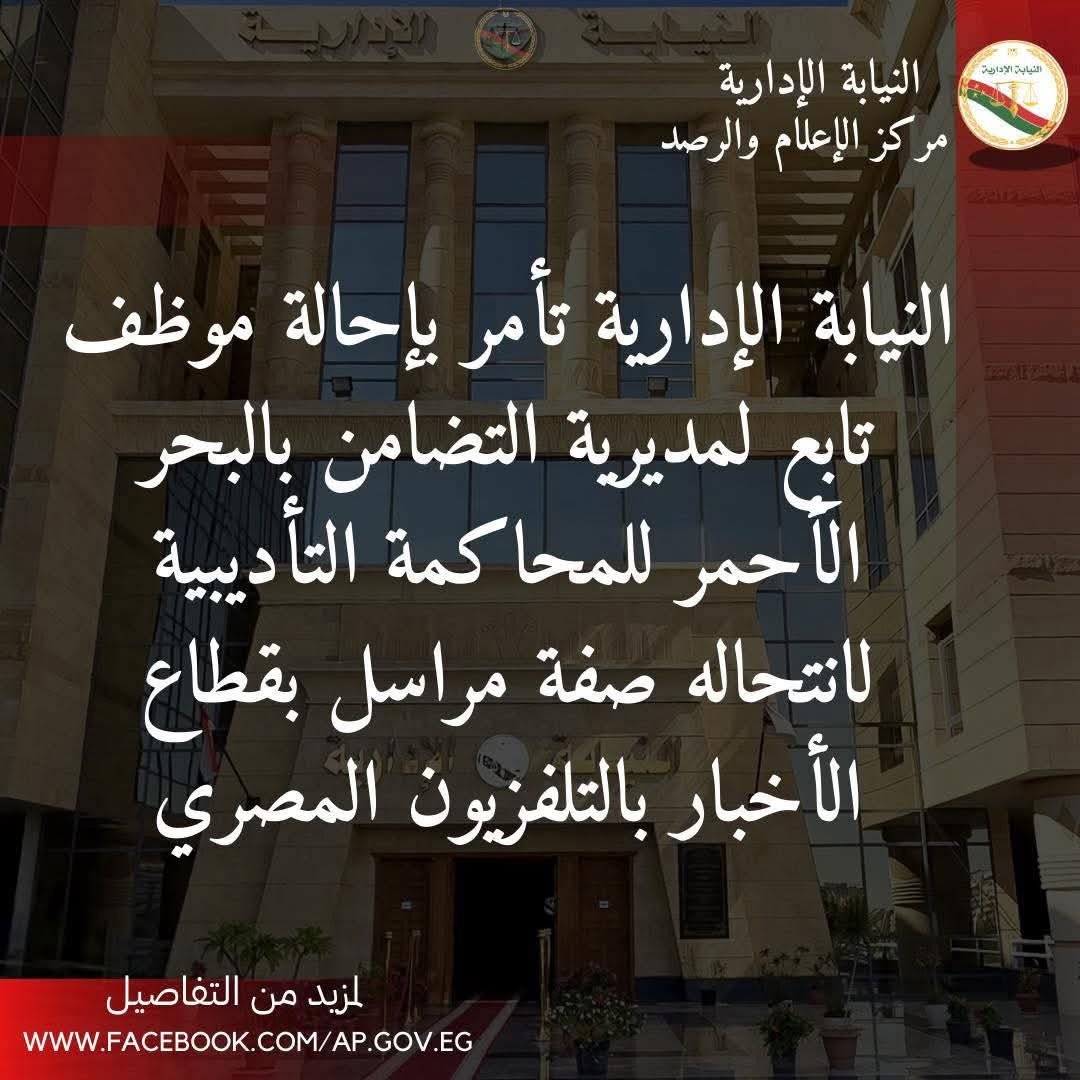 أمرت النيابة الإدارية بإحالة موظف بقسم شئون العاملين بإحدى الإدارات التابعة لمديرية التضامن الاجتماعي بمحافظة البحر الأحمر، للمحاكمة التأديبية؛ وذلك على خلفية انتحاله صفة مراسل بقطاع الأخبار بالتليفزيون المصري بمحافظتي البحر الأحمر والإسماعيلية وتعامله بهذه الصفة مع الجهات الرسمية بالمحافظة ومخالفات أخرى.