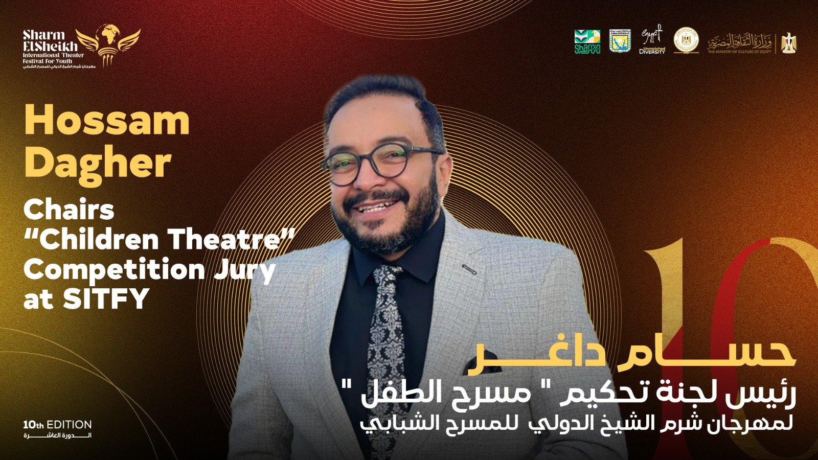 أعلن الفنان حسام داغر خلال المؤتمر الصحفي الخاص بتفاصيل الدورة العاشرة لمهرجان شرم الشيخ الدولي للمسرح الشبابي، برئاسة الفنان والمخرج مازن الغرباوي، عن أسماء لجنة تحكيم مسابقة مسرح الطفل.