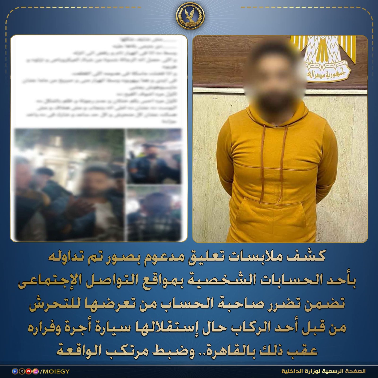 كشفت أجهزة وزارة الداخلية ملابسات تعليق مدعوم بصور تم تداوله عبر أحد الحسابات الشخصية على مواقع التواصل الاجتماعي، تضمن شكوى صاحبة الحساب من تعرضها للتحرش من أحد الركاب حال استقلالها سيارة أجرة وفراره عقب ذلك بدائرة قسم شرطة عين شمس بالقاهرة.