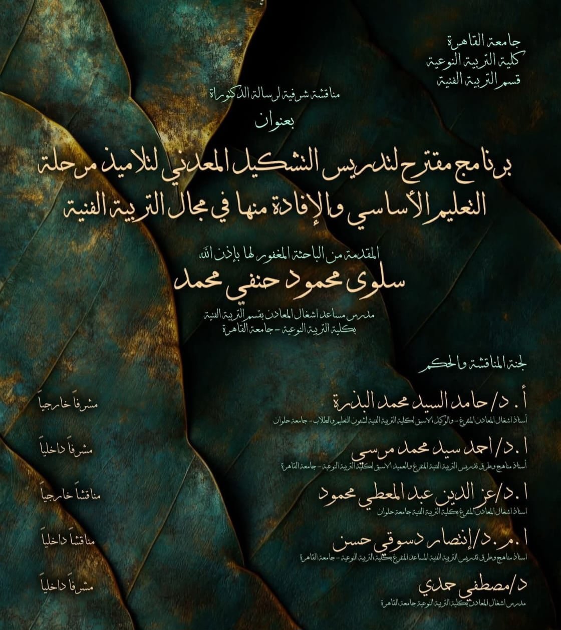 ووفقًا لقرار مجلس الجامعة برئاسة الدكتور محمد سامي عبد الصادق، تضم لجنة المناقشة نخبة من أساتذة التربية الفنية وأشغال المعادن، من بينهم أساتذة من جامعتي القاهرة وحلوان، وذلك لإجراء المناقشة واستعراض الجوانب العلمية للرسالة، تكريمًا لذكرى الباحثة الراحلة.