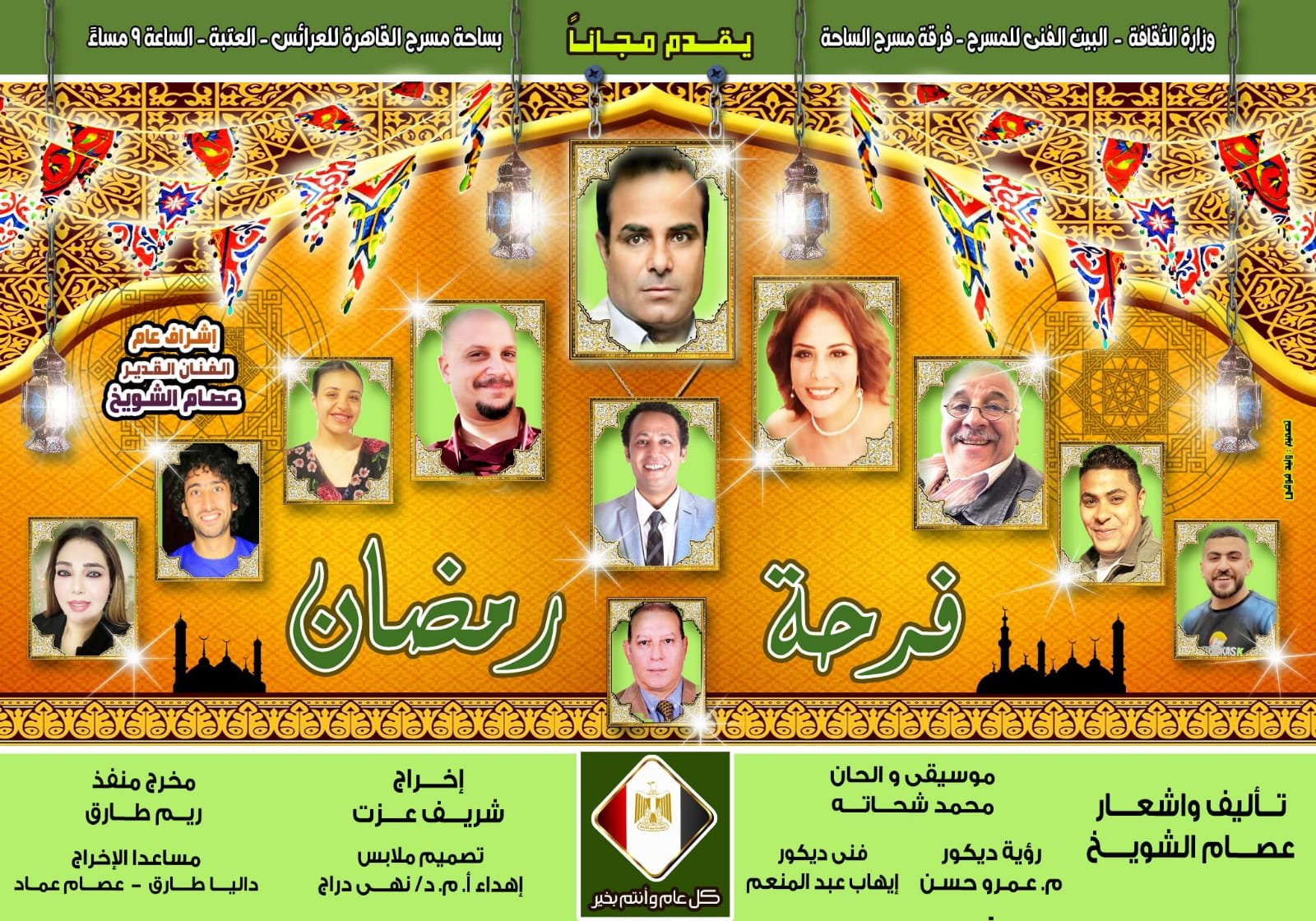 العرض من تأليف وبطولة عصام الشويخ، وإخراج شريف عزت، ويشارك في البطولة: عماد حمدي، نادية الشويخ، محمد عبد الوهاب، فهد سعيد، سامر المنياوي، علاء الوكيل، حسام سيد، إيمان يحيى، وداليا طارق، ألحان محمد شحاتة، تصميم الملابس د. نهى دراج، الديكور عمرو حسن، تنفيذ الديكور إيهاب عبد المنعم، كما يشارك المطرب الشعبي محمد المنسي بقيادة المايسترو إبراهيم علاء في توليفة فنية تجمع بين الأداء التمثيلي والاستعراضات الحية والموسيقى المباشرة.