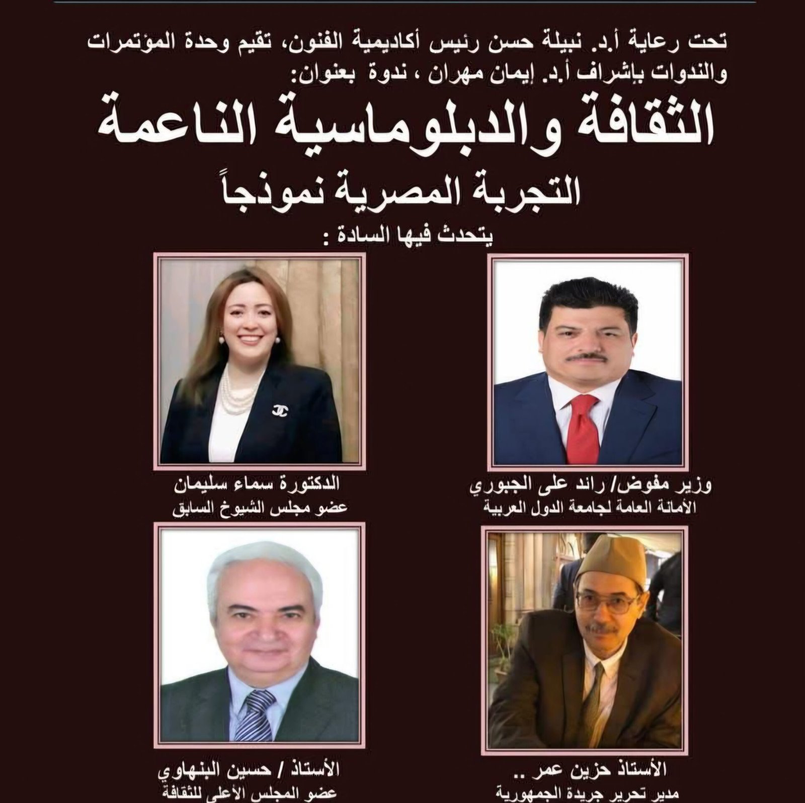 تجمع الندوة كوكبة من القامات، التي تمزج بين الحنكة السياسية والرؤية الإبداعية، حيث يتحدث فيها كل من: الدكتور رائد علي صالح الجبوري، الوزير المفوض بجامعة الدول العربية، مستعرضاً الأبعاد العربية لهذا التأثير، والدكتورة سماء سليمان، عضو مجلس الشيوخ السابقة، في قراءة للدور التشريعي والمجتمعي، الكاتب الكبير حُزين عُمر، مدير تحرير جريدة الجمهورية، ليحلل دور الكلمة في تشكيل الوجدان الجمعي، والدكتور حسين البنهاوي، عضو المجلس الأعلى للثقافة، باحثاً في فلسفة الإنتاج الفني وتأثيره الكوني.