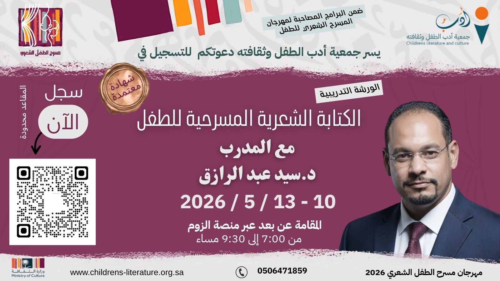 في خطوة لتعزيز النصوص المسرحية الموجهة للصغار، وتحت شعار الكلمة للطفل على المسرح أثرٌ ممتد، أعلنت جمعية أدب الطفل وثقافته، ضمن برنامج الدعم مقابل الأداء التابع لوزارة الثقافة بالمملكة العربية السعودية، عن تنظيم ورشة عمل مكثفة مخصصة لفن كتابة المسرح الشعري للطفل. يقدمها الكاتب المسرحي الدكتور سيد عبد الرازق.